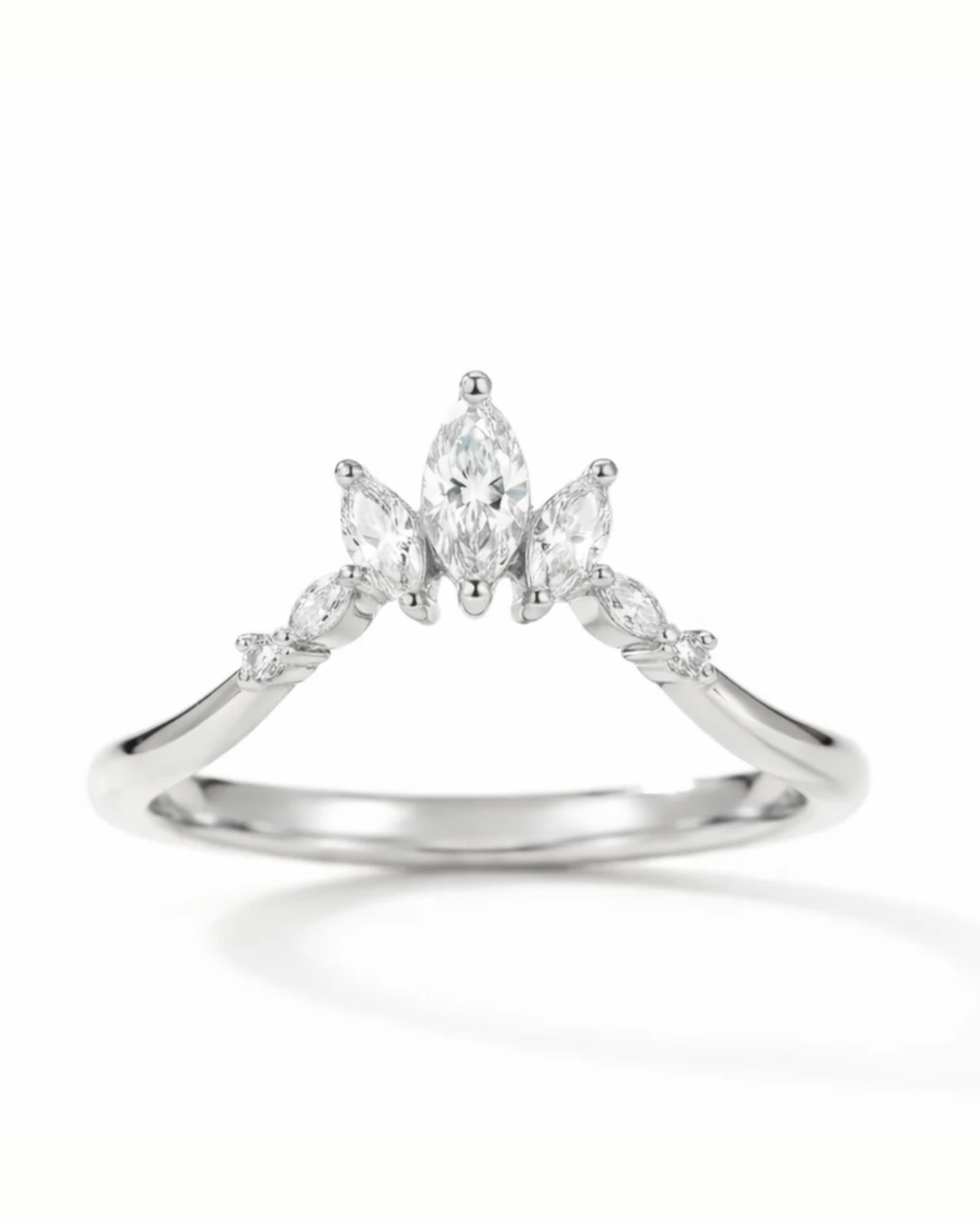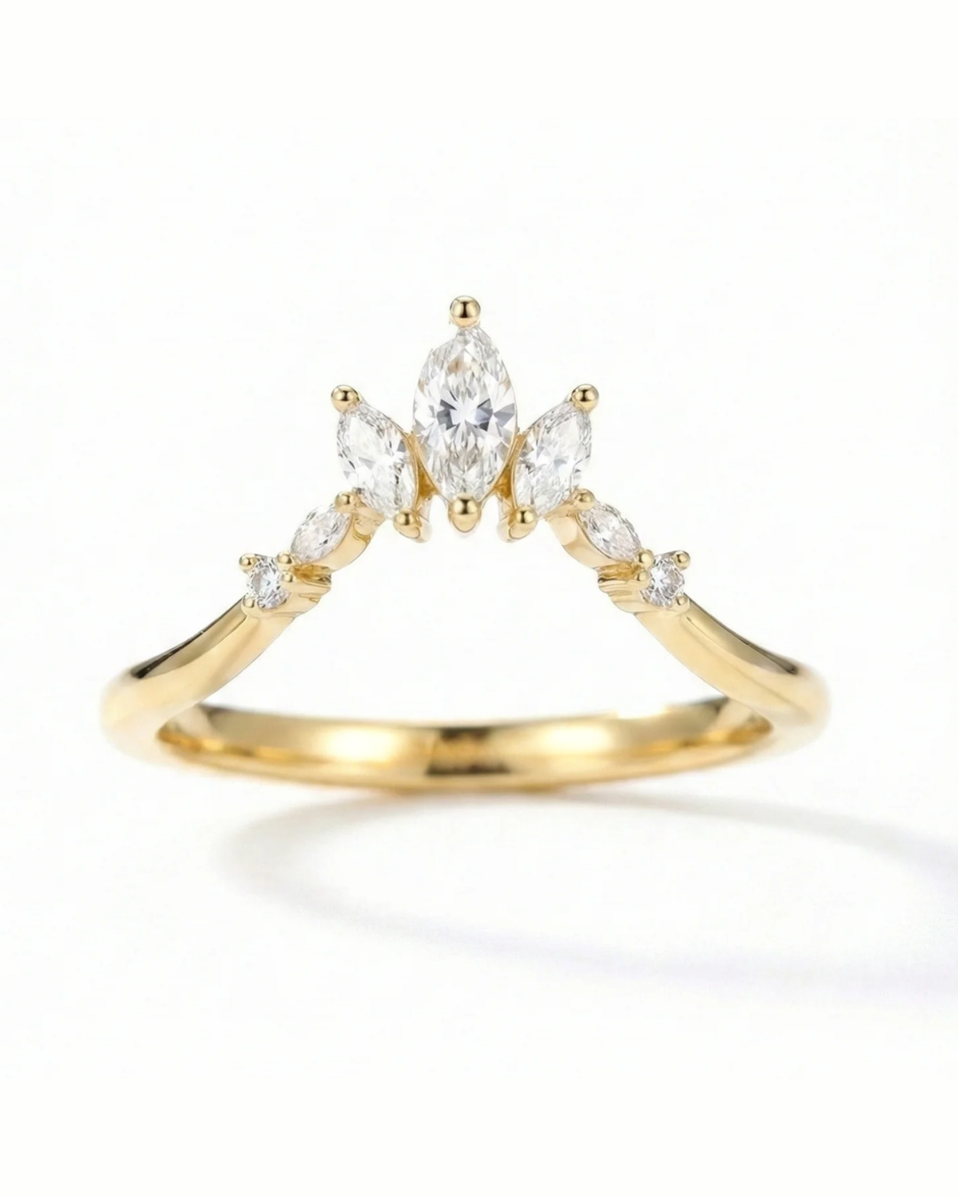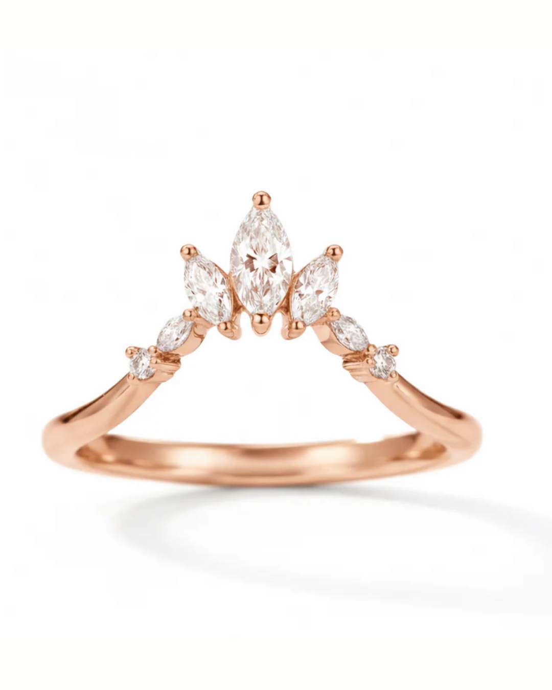 The Clara Band is a graceful crown of marquise and round stones, designed to frame your center ring with soft brilliance. Delicate yet striking, it adds height, sparkle, and romance to any stack.