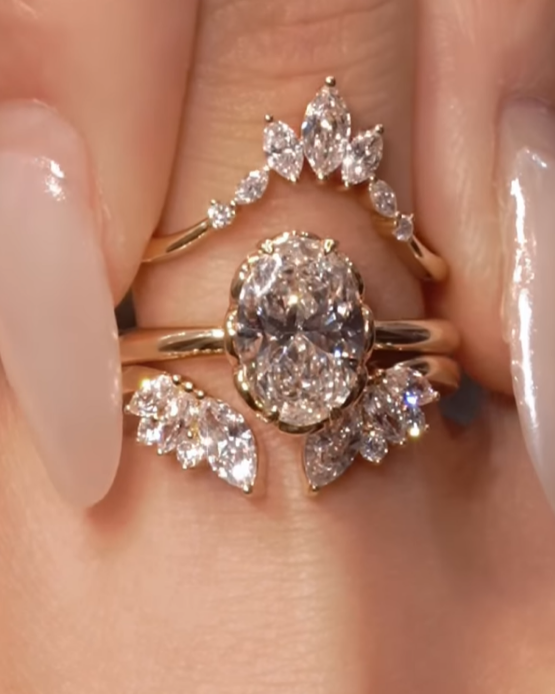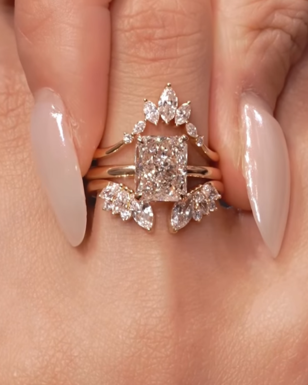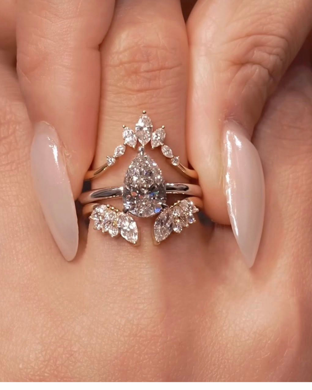 The Clara Band is a graceful crown of marquise and round stones, designed to frame your center ring with soft brilliance. Delicate yet striking, it adds height, sparkle, and romance to any stack.