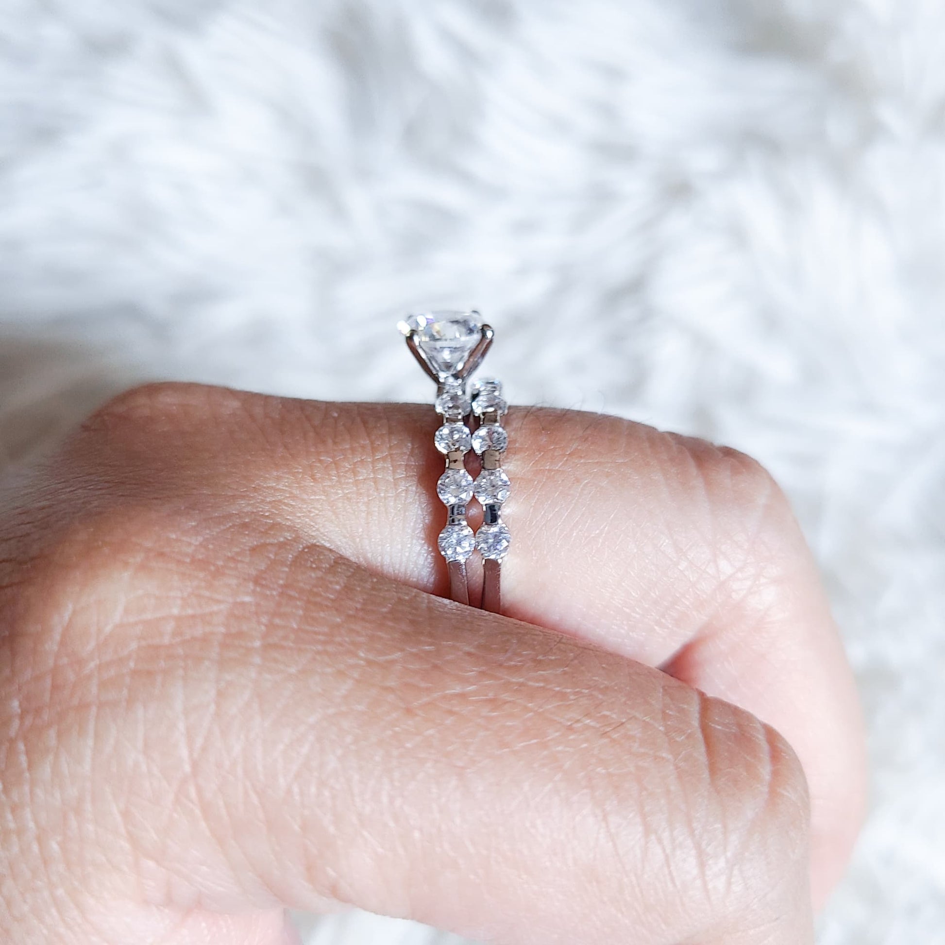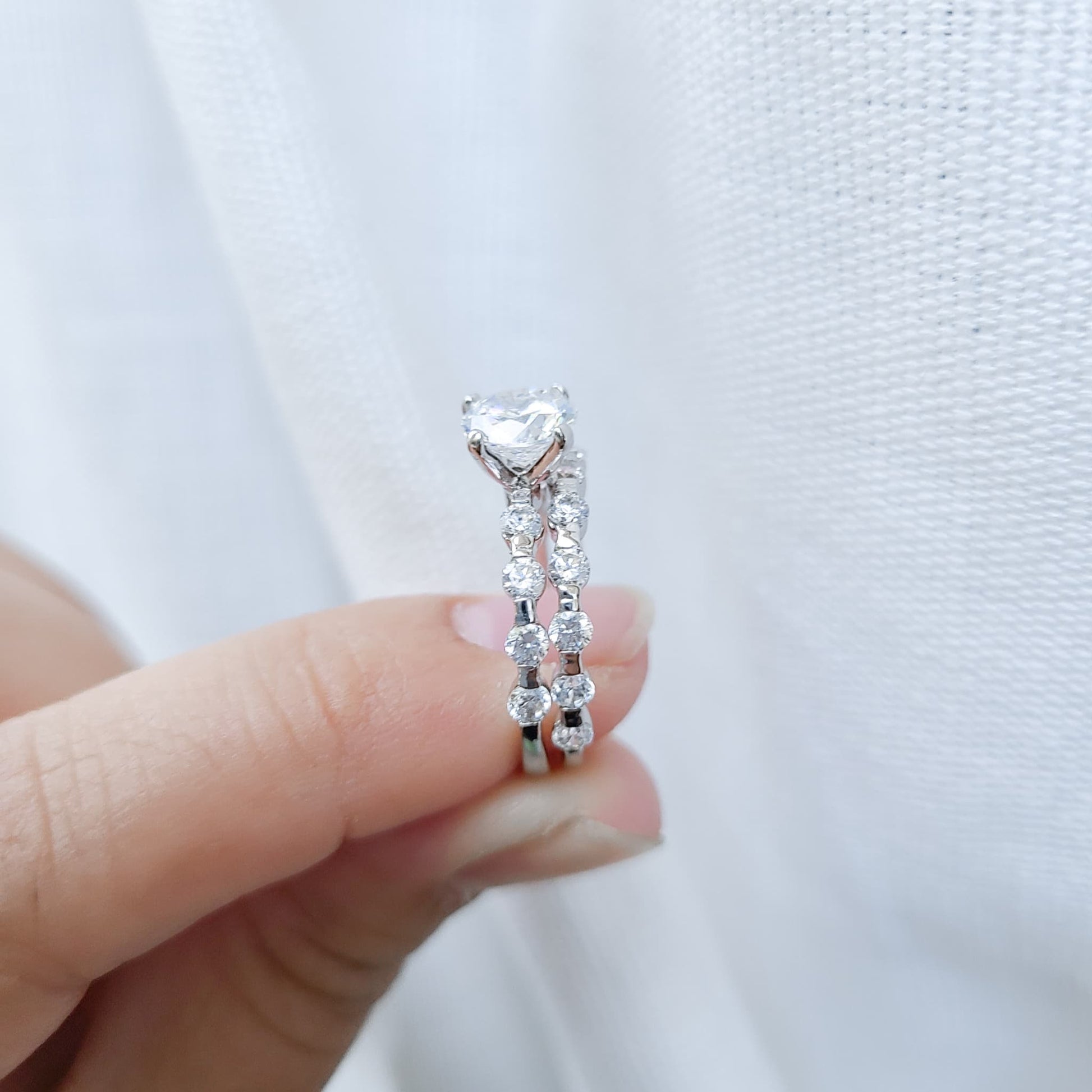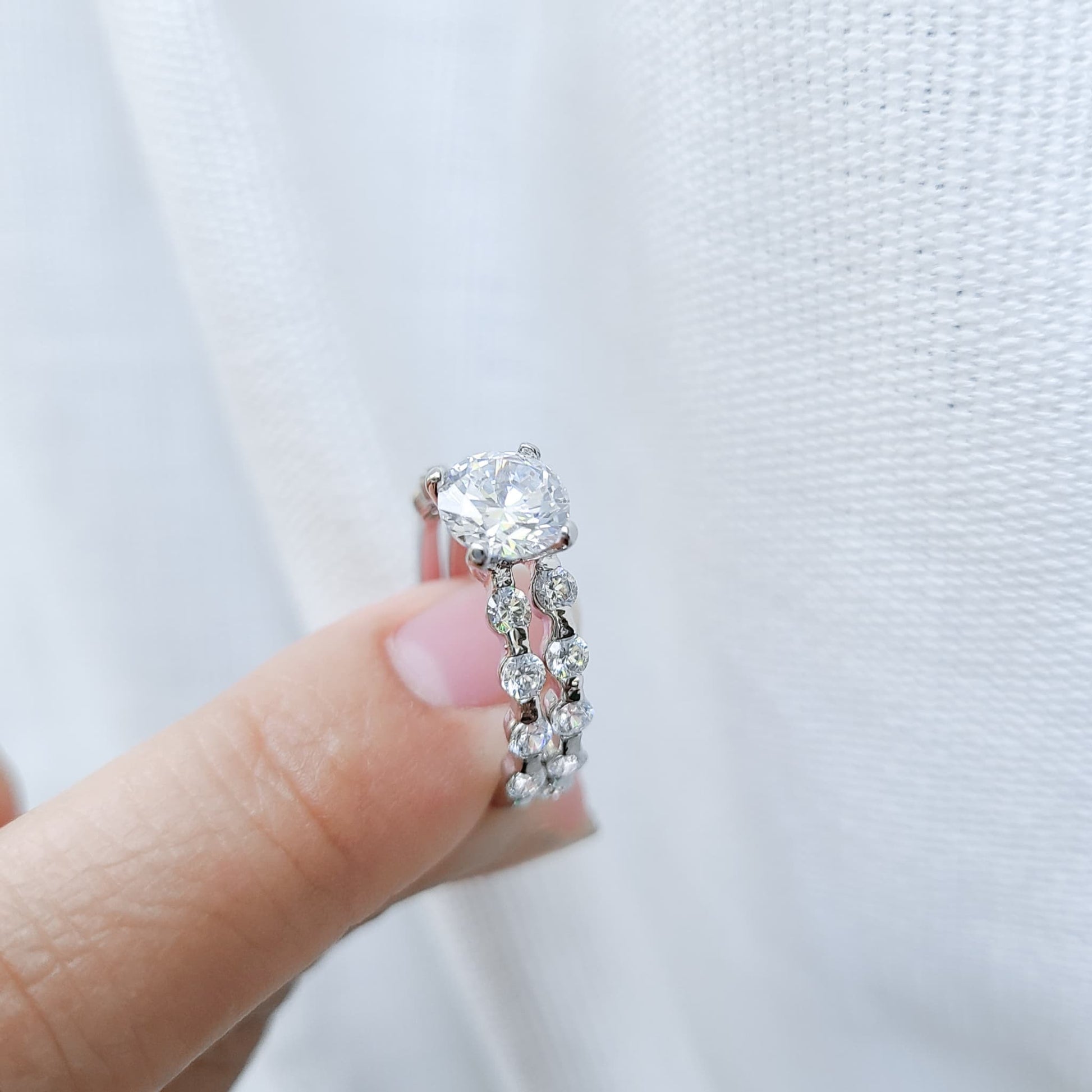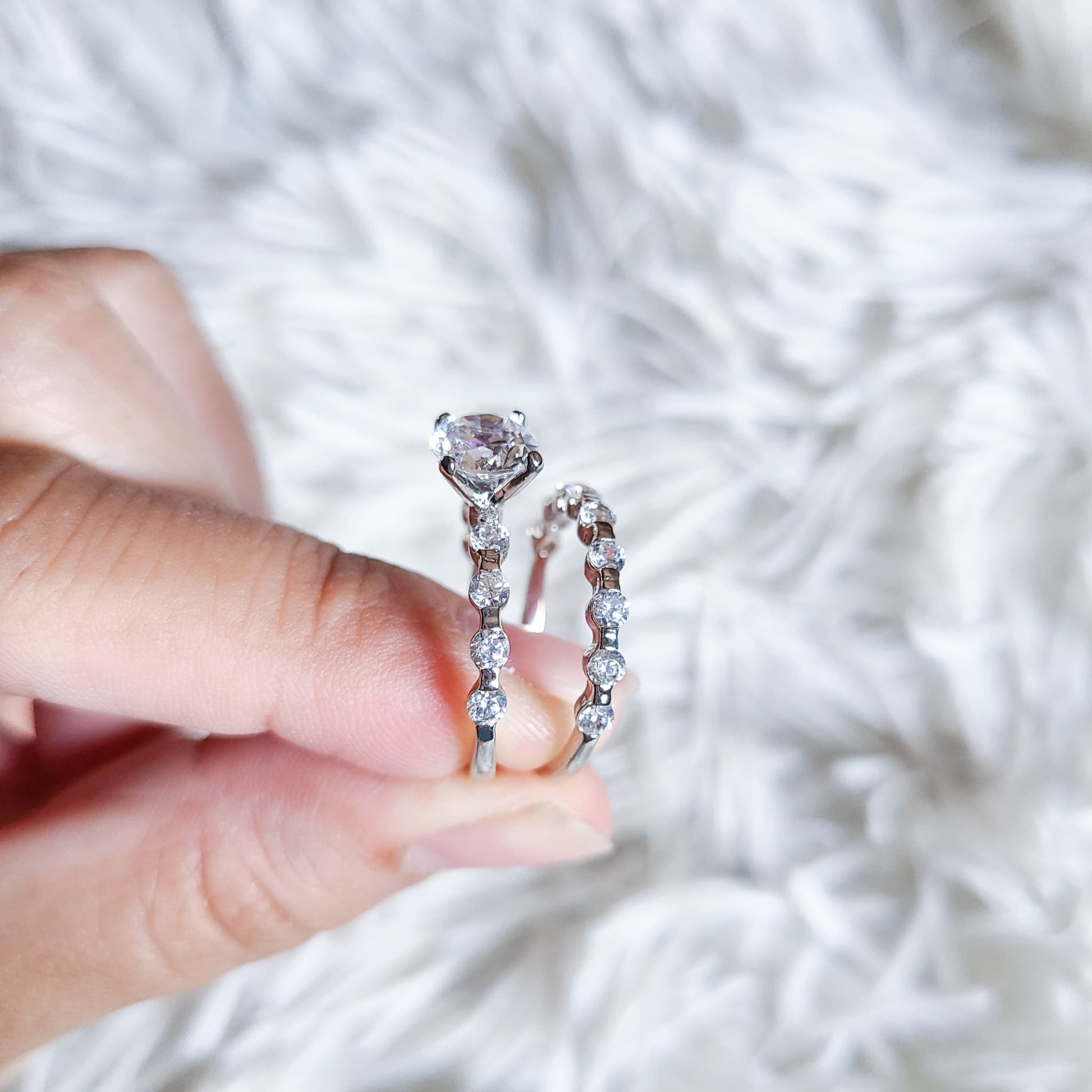 An engagement ring and wedding band set that tells a story of unity and forever love—Tessa features a round-cut center stone set in a bar setting, paired with a matching band for a seamless and harmonious look. Designed for modern romantics, this ring set symbolizes unbreakable bonds and shared journeys.