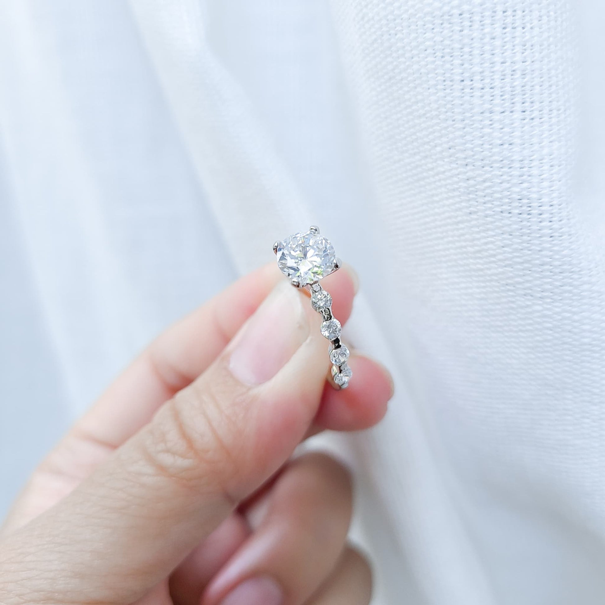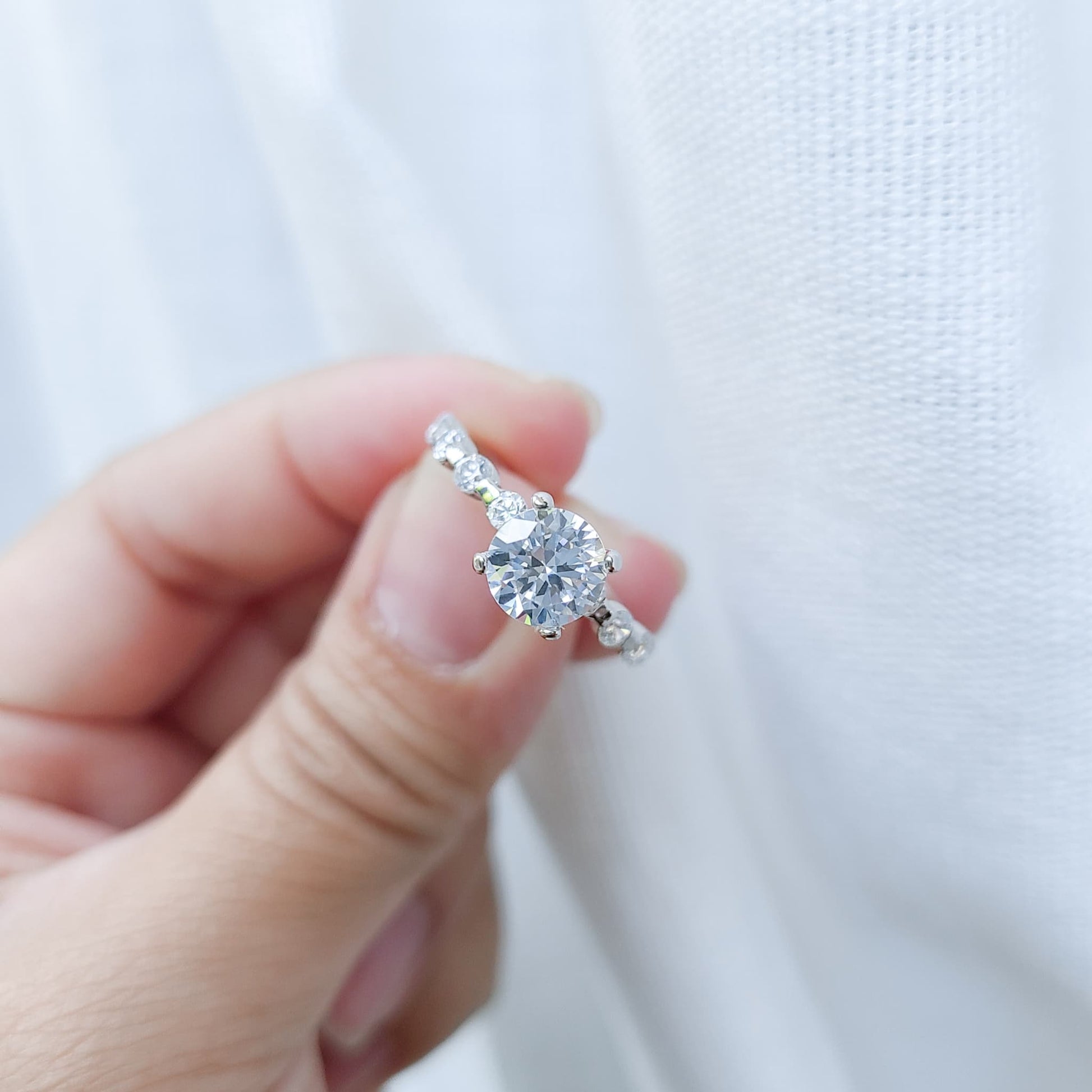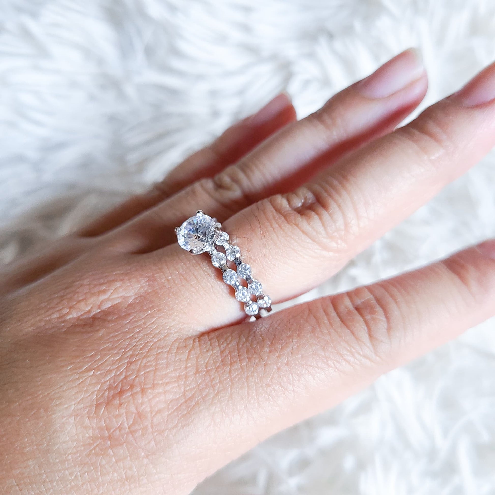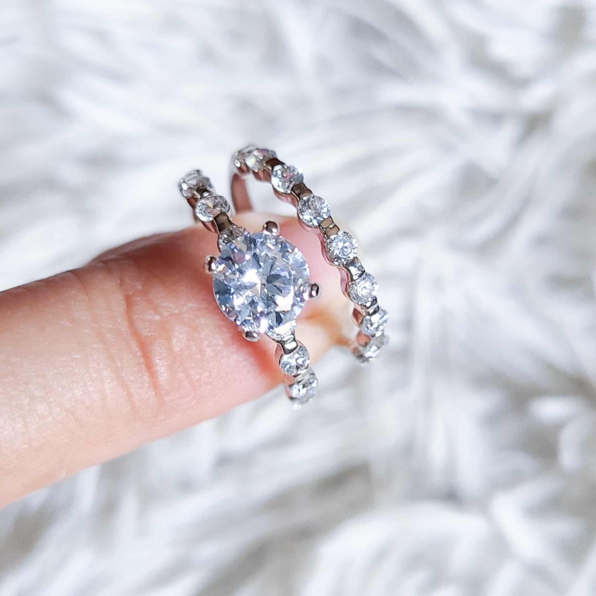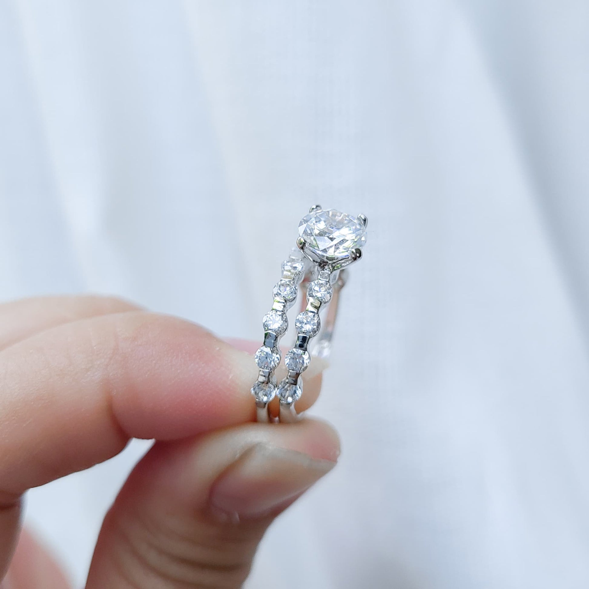 An engagement ring and wedding band set that tells a story of unity and forever love—Tessa features a round-cut center stone set in a bar setting, paired with a matching band for a seamless and harmonious look. Designed for modern romantics, this ring set symbolizes unbreakable bonds and shared journeys.