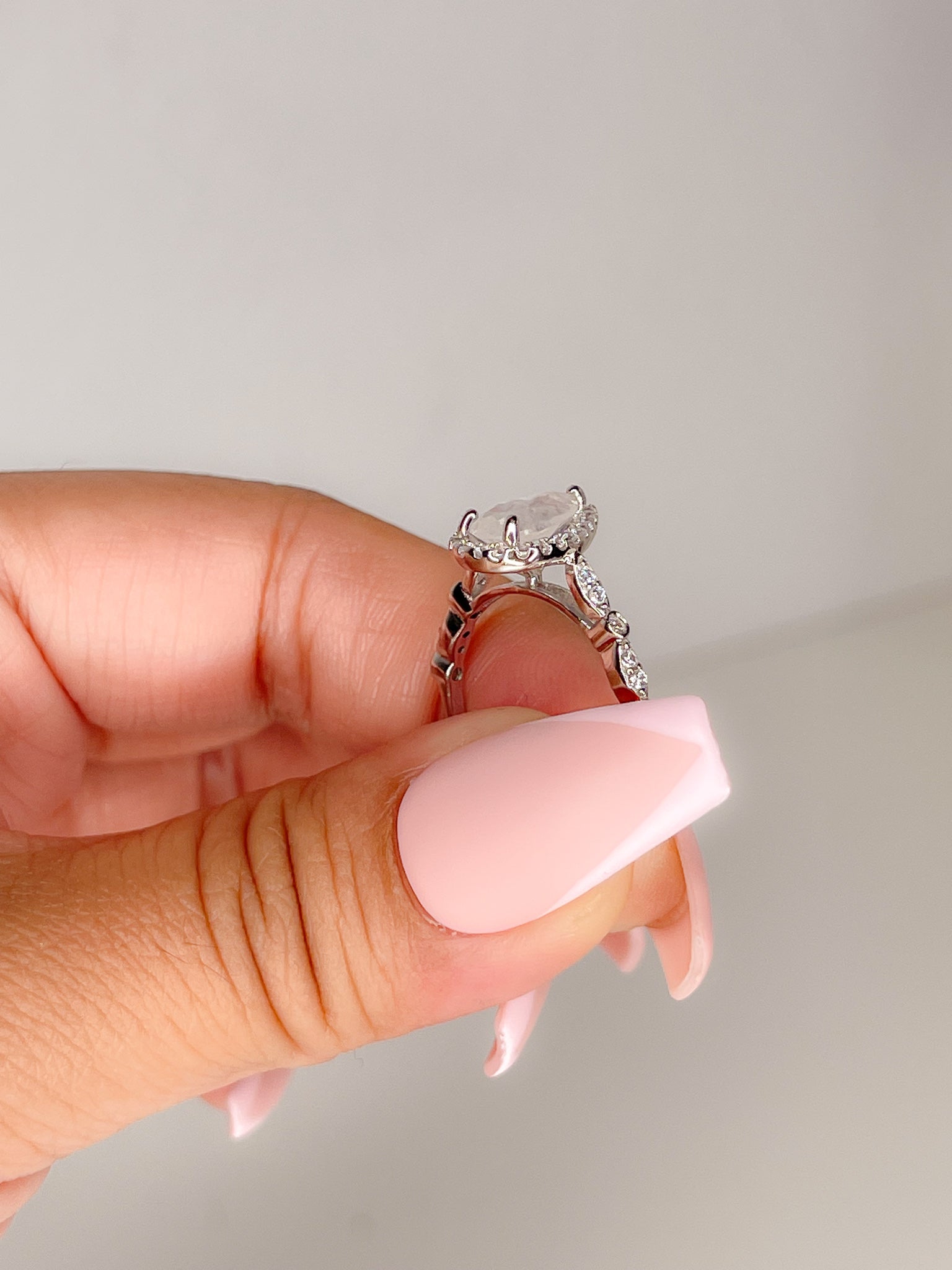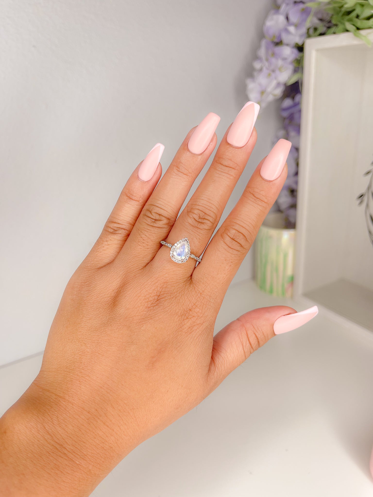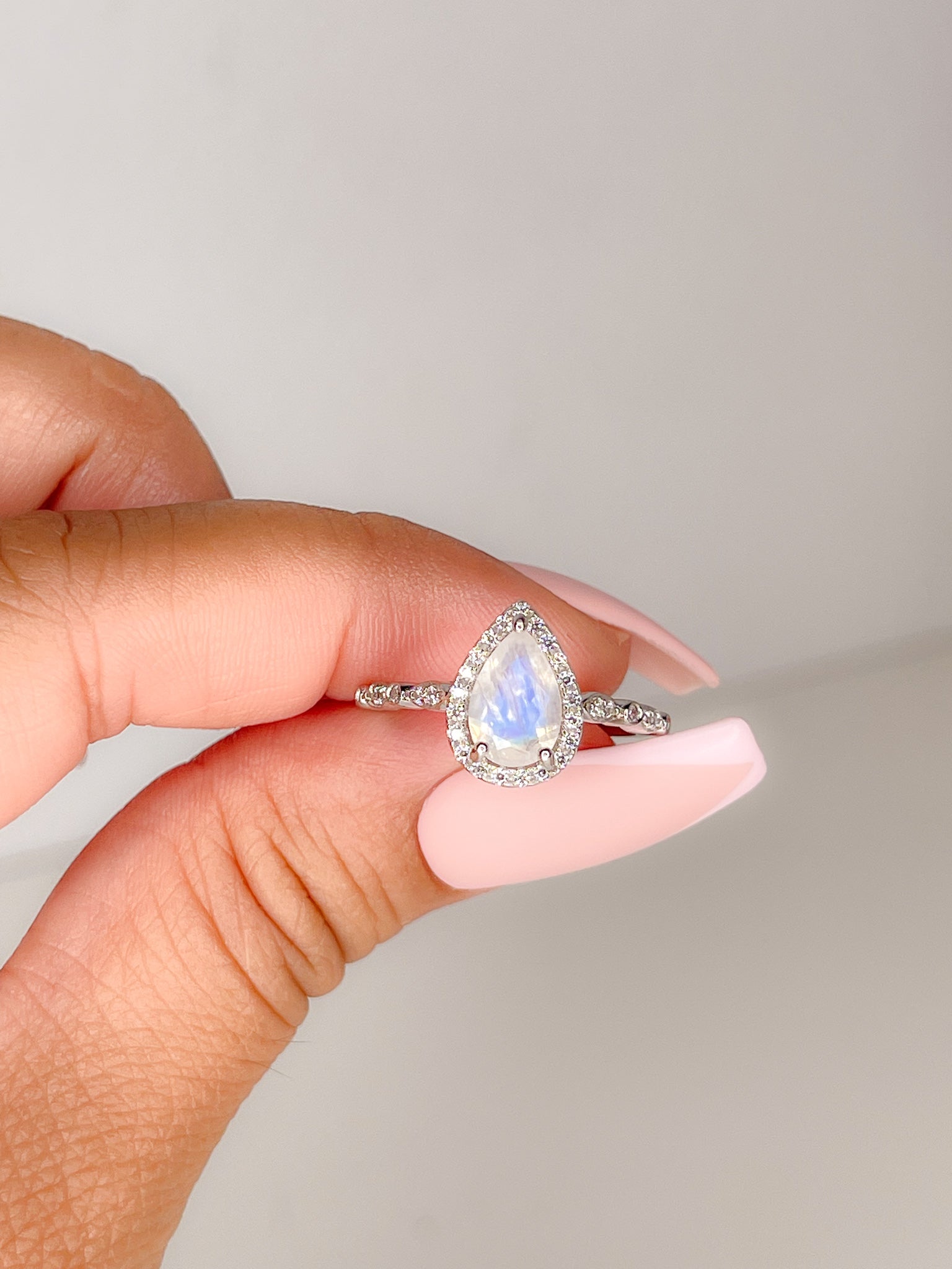 A true classic, the Jane Ring features a mesmerizing teardrop-cut moonstone encircled by a delicate halo of sparkling stones. This design exudes timeless elegance, making it a perfect choice for an engagement ring, promise ring, or an everyday luxury piece.